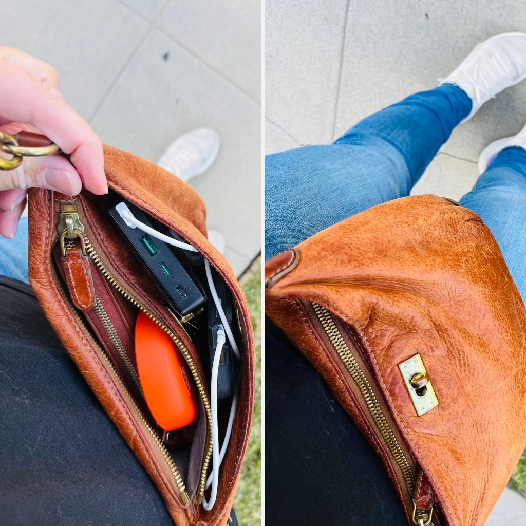 A cross-body purse is not quite as safe as a money belt, but I’ve never enjoyed shoving those inside my clothes and having to awkwardly trying to retrieve things when I need them.